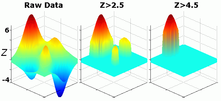 7、考虑左侧面板中显示的原始状态图,而中间面板已经被设置为仅显示Z-分数大于2.5的体素(三个区域存活该阈值),右侧面板显示更保守的Z> 4.5的阈值 - 只有一个高峰幸存下来。