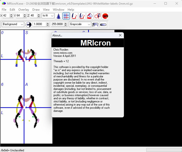 MRIcron允许您从“文件”菜单打开需要的文件,将其载入主窗口,让您在三个不同的面板中在X,Y和Z轴上查看它。可用的视图模式是“轴向”,“冠状”,“矢状”或“多个”。