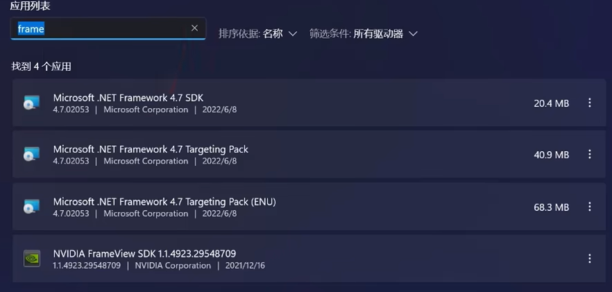 3、进入应用设置后,在搜索框直接搜索我们所需要的环境,Framework,我这里是已经安装好了的。如果你电脑上没有安装的话可以直接点击此处下载安装