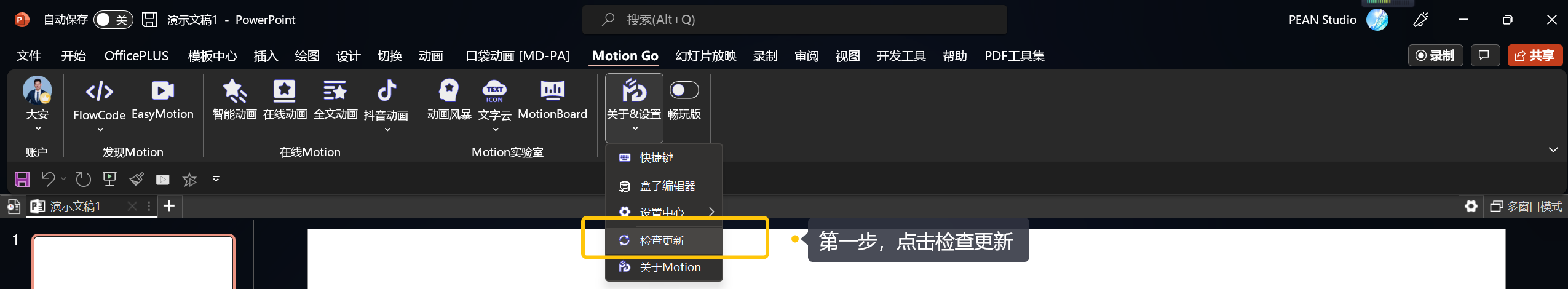 在打开PPT情况,如果你想要查看你的版本号或者主动点击检查更新,可以在专门的入口中操作。
