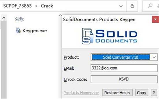 6、接着运行注册机“Keygen.exe”,选择Solid Converter v10,输入邮箱信息,生成解锁密码