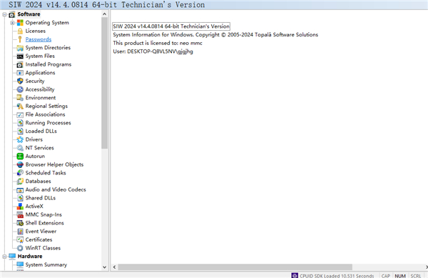 5、软件信息:操作系统,软件许可证(产品密钥/序列号/CD密钥),安装的软件和修补程序,进程,服务,用户,打开文件,系统正常运行时间,安装的编解码器,密码恢复,服务器配置。