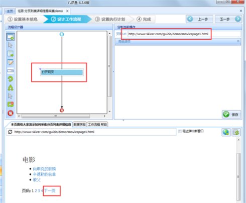 3、上图配置完毕之后,选择下一步,进入到流程配置页面,往流程设计中拖入一个打开网页的步骤。