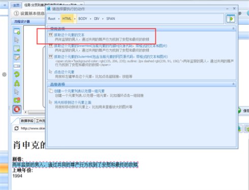 下面进行数据字段的提取,点击上图流程设计器中的提取数据,再选择浏览器中需要提取的字段,然后在弹出的选择对话框中选择抓取这个元素的文本;