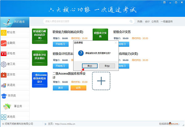 2、我们随便点击一个题库的开始练习,软件会提示你课程读取失败,是否重新注册?我们选择是。