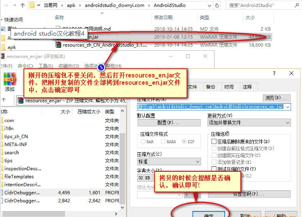 5、打开resources_en.jar压缩包,把复制的文件全部粘贴到resources_en.jar里面中,点击确认,如图: