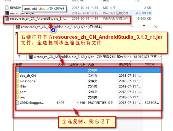 4、打开下方的resources_zh_CN_AndroidStudio_3.1.3_r1.jar压缩包(不是解压),里面会出现一推文件,这个时候我们直接全选复制里面的所有文件,如图: