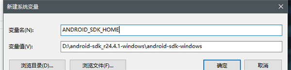 11、新建一个系统环境变量,变量名为ANDROID_SDK_HOME,变量值为你的SDK安装路径。