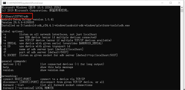 13、检测是否配置成功,打开命令行窗口(Win+R)输入adb,出现如下图所示内容表示配置成功。