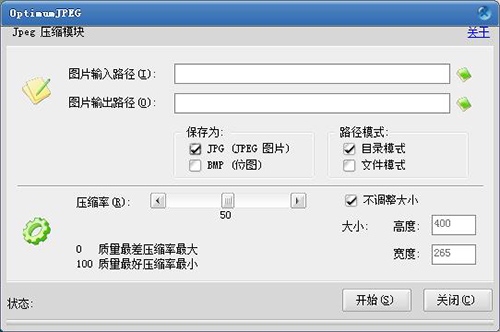 1、文件模式可对单个文件进行压缩,目录模式对文件目录中所有图片进行压缩。在图片输入路径里选择要压缩的文件或文件夹,选择图片输出的路径指定图片输出的文件夹。2、拖动调整压缩率的滚动条,调整图片的压缩率,若图片本身不大,建议将压缩率调高些,这样可以使压缩后的图片更清楚。在右侧可输入输出图片的高度和宽度,单位是像素。