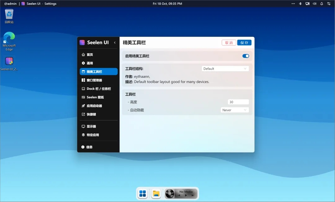 启用“Fancy Toolbar”后,用户可以将 Seelen 工具栏放在桌面顶部,替代 Windows 默认的任务栏。