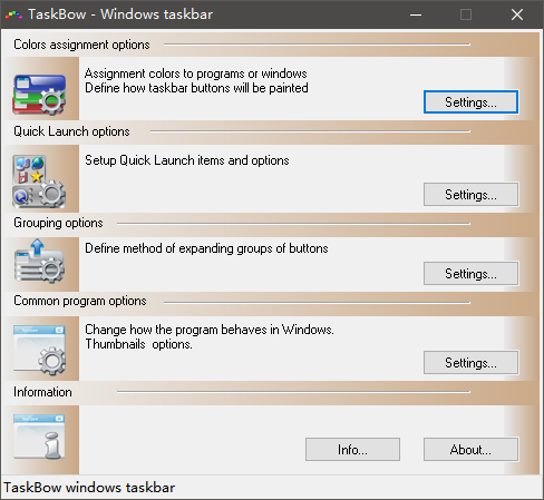 TaskBow是任务栏的外观修正定制工具,可以简单地定制你的任务栏的外观,使任务栏变得漂亮。这样的工具虽然功能少,但有时会发挥工作的一半哦。TaskBow(自定义任务栏工具)是一个非常实用的工具,也是一个很好的美化软件,它是什么样的软件,必须根据你的使用目的来理解。TaskBow的体积很小,而且是一个单文绿色版的软件,所有的效果在运行该软件的时候才会生效,所以不会破坏windows默认设置。
