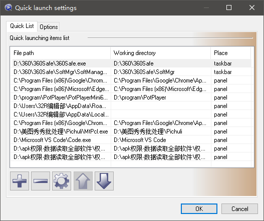 2、“Quick Launch options”:这个可以让你在任务栏上使用额外的快速启动栏。TaskBow提供的快速启动栏和windows默认的相比拥有多种优势:首先,如果按钮太多,那么会使用弹出式菜单的方式显示,而任务栏上不会有那个多余的箭头按钮。然后,菜单在鼠标经过时是自动弹出的,而不是像默认的那样必须点击按钮才会弹出。最后,弹出的菜单你可以设置每行显示数,这个可以在settings的options中设置。所以你可以把这个看作是一个精简版的MAC Grid效果。