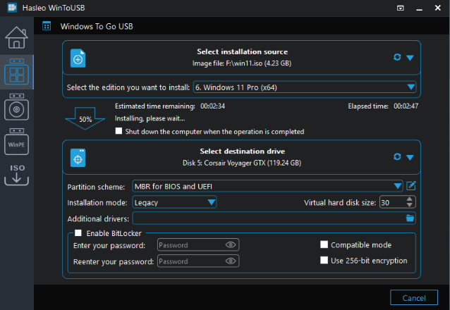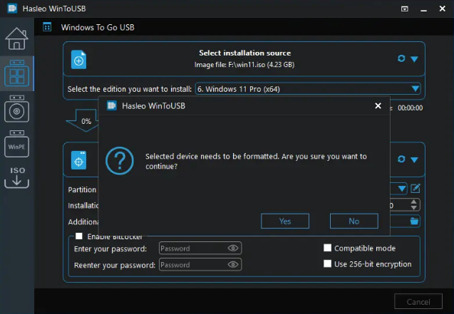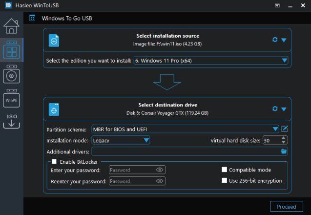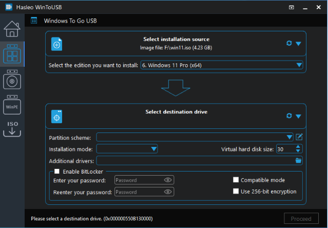 有关“分区方案”、“安装模式”和“启用BitLocker”的更多详细信息,请参阅:(https://www.easyuefi.com/wintousb/faq/en-US/How-to-use-WinToUSB-ISO-To-USB.html)