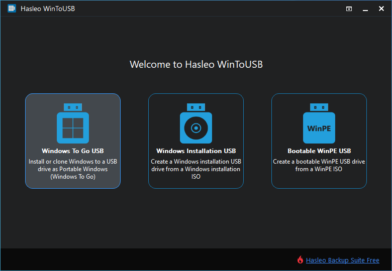 第一步。将USB驱动器连接到计算机,下载、安装并运行Hasleo WinToUSB,然后单击“Windows To Go USB”。