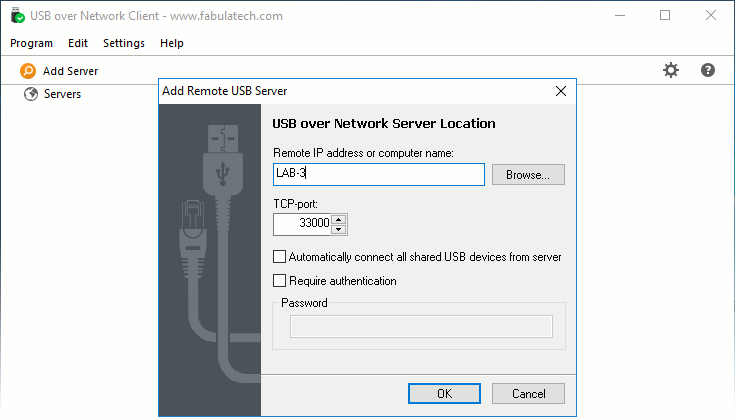 点击浏览要选择带有共享USB设备的远程计算机,请单击好。因此,指定网络服务器上的USB将被添加到服务器列表中。如果服务器此刻是活动的,程序将显示服务器上共享的USB设备的实时列表。