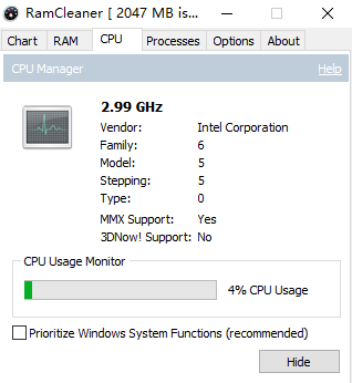 2、可以帮助用户清晰了解本机内存、CPU、运行进程的详细情况,包括制造商、系列、型号、类型以及是否支持 MMX 等。