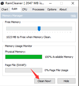 1、双击“RamCleaner.exe”打开软件,点击RAM选项自动扫描垃圾内存,点击下方即可清理。