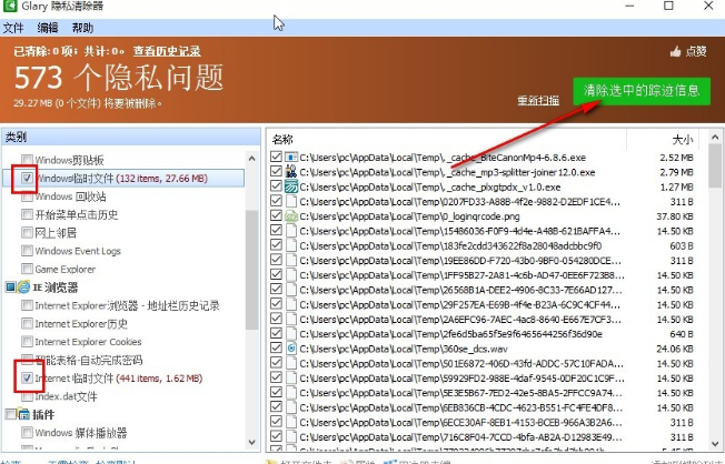 3、之后下一步我们根据自己的需求选择左边扫描出来的这些隐私数据之后,我们勾选有隐私数据的选项,然后点击右上角的“清除选中的踪迹信息”这个按钮。