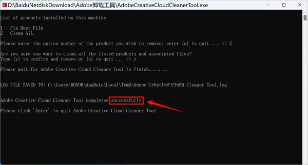 6、在看到消息“Adobe Creative Cloud Cleaner Tool 已成功完成”或“successfully”时,请按 Enter,并重新启动计算机。