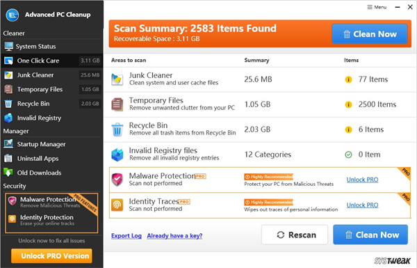 先进的PC清理功能将清理屋顶下不同部分的多项任务结合在一起,使您的工作更加轻松。它向您显示有害文件占用的空间。您可以一次清除回收站中的所有垃圾,临时文件和文件。它还会删除无效的注册表项,以提高系统性能。