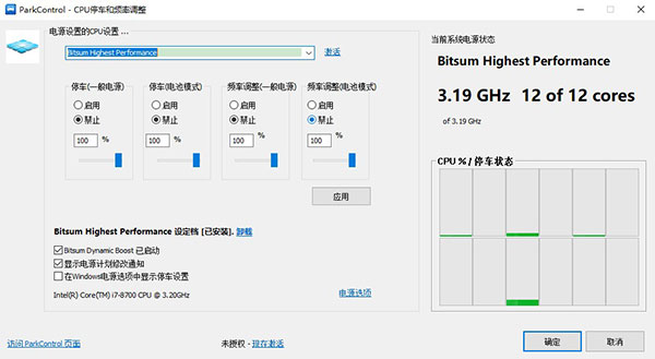 1、当你开启「Bitsum 动态加速」功能时,ParkControl中文版会为你激活并启用「Bitsum Highest Performance」(最佳性能) 电源计划。这会禁用系统的内核停车和 CPU 调频,并由 ParkControl 为你管理和维护。