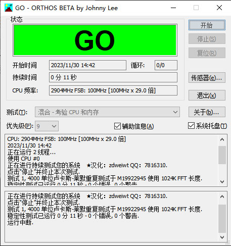 2、用ORTHOS测试时, 用Large,in-place FFTs(适当大量FFTs,着重内存)项目出错时间比其它项目出错时间要来得更快一些,由此说明,Large,in-place FFTs(适当大量FFTs,着重内存)的选项对CPU稳定性有更高的要求