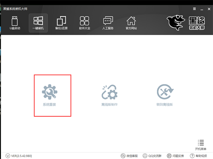 1、打开黑鲨装机大师,在一件装机模块,然后点击“系统重装”