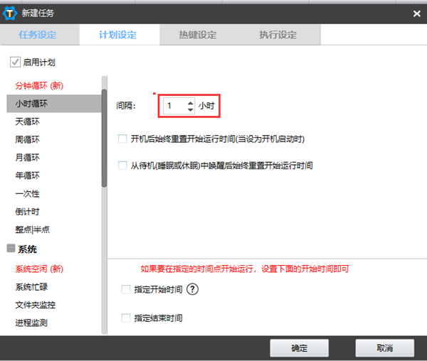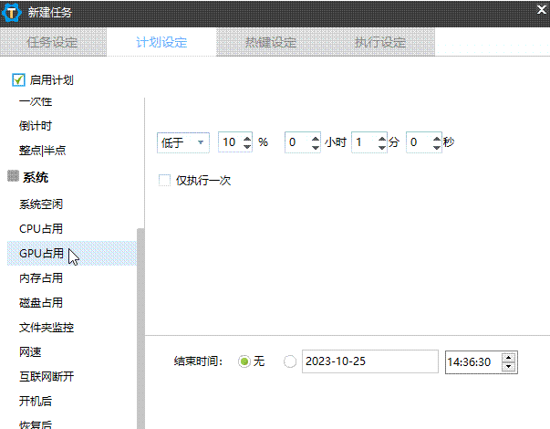 超过30种触发方式,秒、分钟、小时、天、周、月、年、指定日期、倒计时、整点半点循环,并支持农历。根据系统空闲时间、文件夹监控、CPU|GPU|内存|磁盘占用、网络、硬件、开机延迟、休眠恢复后延迟等条件触发,支持热键触发。