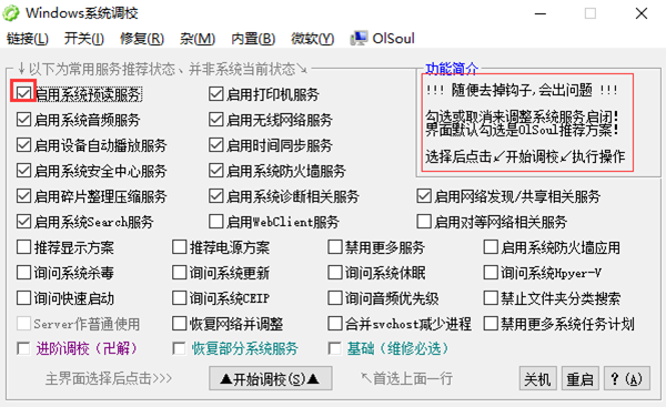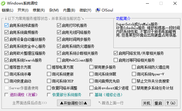 OlSoul是一款功能强大Windows系统调校软件,内置无线网络,服务器,打印机等多项功能一键式启用,设备自动播放、系统休眠和快速启动等内部功能一键开关,众多具体调校功能多达几十项,帮助用户方便快捷的启动电脑中实用但难寻的新功能、小功能,减少用户搜寻查找的时间,实现对系统进行更好的调试和优化设置。
