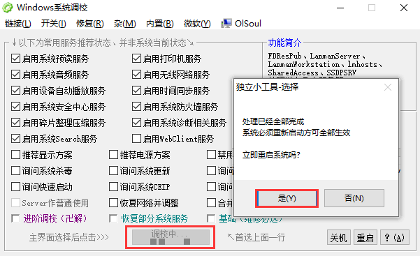 进入软件页面勾选想要进行调试的服务项目,点击下方“开始调校”,选择“是”。
