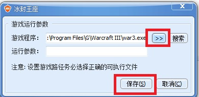 6、点击箭头,找到游戏目录,选择游戏运行文件(通常是exe结尾,比如魔兽3是war3.exe),选好以后,点击“保存”。