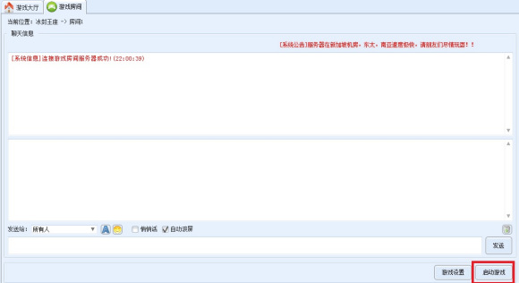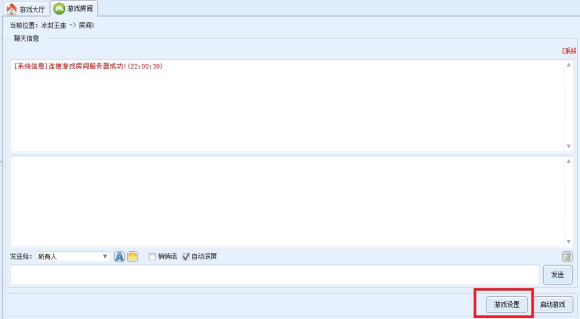 5、进入房间后,可以看到房间的聊天窗口,右边是在同一个房间的玩家,可以加好友,也可以聊天,第一次玩游戏,需要设置游戏路6径,点击右下角的“游戏设置”。