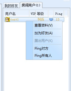 9、房间右边右键单击好友,可以看到好友资料,加为好友,看对方网速,也可以测试自己的网速。目前我们开通了第一个服务器,在新加坡亚马逊机房,经测试,国内和东南亚国家完美接入。