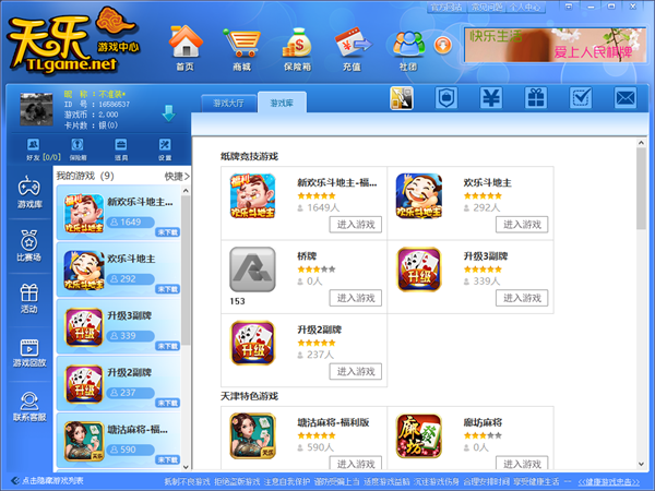 1、天乐游戏大厅拥有多种具有地方特色的游戏如塘沽麻将、廊坊麻将、天津麻将、塘沽毛二、毛四、天津砸六家、砸红A、憋七、二八杠等