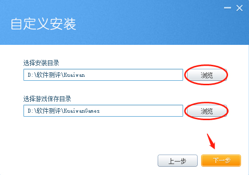 2、我们可以自己设定软件安装路径,以及日后使用快玩游戏盒子加载的游戏路径,根据你个人偏好来进行设定,设定完成后继续安装