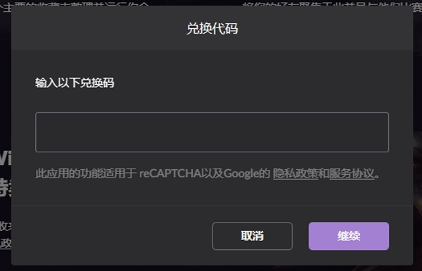 2、找到兑换码窗口,输入兑换代码,点击继续即可。