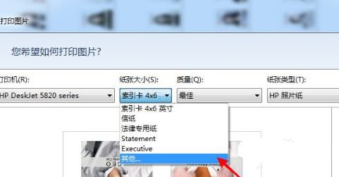 在纸张大小列表中点击【其他】选择与照片纸大小一样的尺寸;
