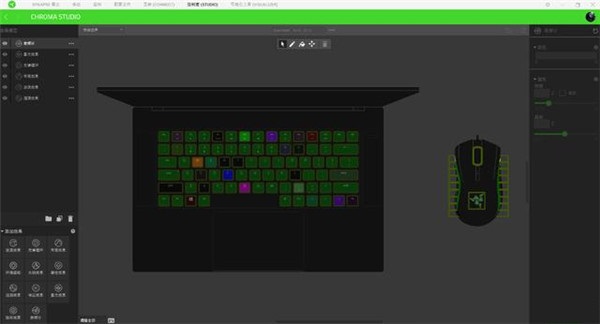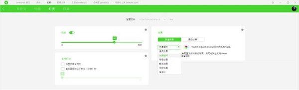 进入高级效果后,界面会同时出现已连接的所有支持雷云3的设备。刚刚没有介绍到的,电脑上方工具栏的第四个选项就是针对多设备进行移动所用。雷蛇曼巴眼镜蛇精英版依然可在左侧选用灯光效果,并在右侧对效果编辑。