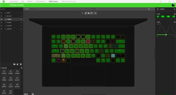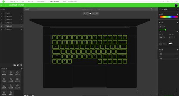 进入界面后,雷蛇灵刃15的键盘占据了主要面积,左下工具栏可以添加效果,选择后会在左侧的效果图层看到,各种效果可以进行叠加,甚至可以叠加同一效果。点选任一效果后,可以在界面右侧编辑栏对该效果进行调整,视乎效果编辑栏会有所变化。