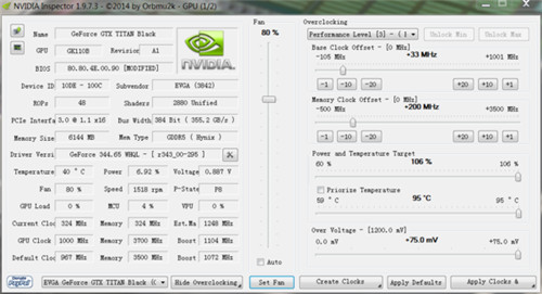 2、在Performance Level [3]里,将Power and Temperature Target(功耗和温度目标)拉到最大,Over Voltage(核心电压)也拉到最大,依次调节Base Clock(基础频率)、Memory Clock(显存频率),比如我图里+33MHz的基础频率和200MHz的显存频率,显卡的默认频率就由原来的967/7000变成了967+33/7000+200*2=1000/7400,然后点击Apply Clock,设置生效,上面的数据根据经验和显卡体质来调整。