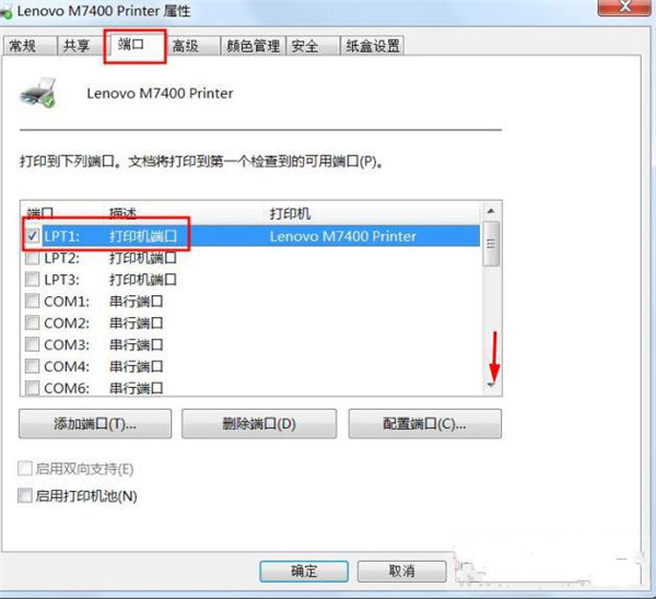 端口错了是打不了的,很多用户都是这里错了,用USB线连的这里却勾选的却是LPT端口。如果是这里错了只要改成相应的就行了,修改方法很简单,按住右边的滚动条往下拉