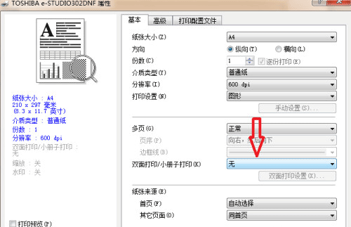 4、在基本选项下找到【双面打印/小册子打印】,并点击右侧的下拉条。