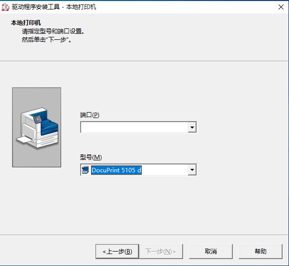 5、指定型号和端口设置,端口可自定义选择,如COM1、COM2,型号选择DocuPrint 5105 d,完成点击喜爱一部