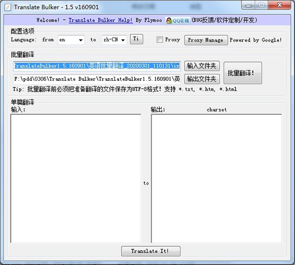 Translate Bulker是一款功能强大好用的,可以实现对各种语言文件翻译的软件。软件支持批量翻译也支持单篇翻译,还支持多国语言互相翻译批量翻译前必须把准备翻译的文件保存为UTF-8格式,支持*.txt、*htm、*html等格式。软件应用原理是:调用Google Translate API批量把输入文件夹(IN)的所有文本文档翻译好,然后保存到输出文件夹(OUT)里,用户在输出文件夹里就可以找到已经翻译好的文本了。 >