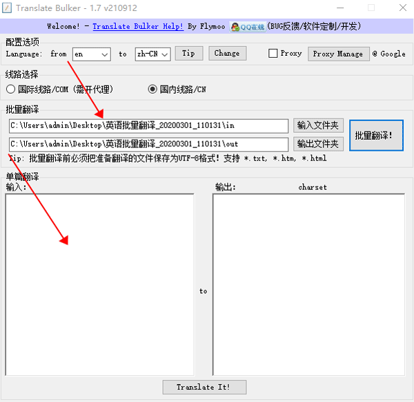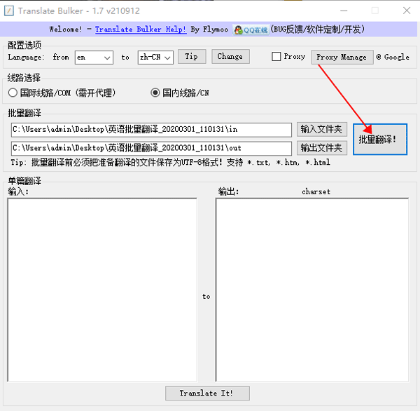 选择输入文件夹(IN)、输出文件夹(OUT),把你需要翻译的所有文本文件放到输入文件夹(IN)里,点击 Bulk Translate 即可自动批量翻译。