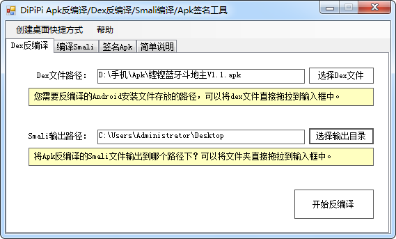 a、使用“Dex反编译”功能,先将Apk进行反编译,得到所有的Smali文件(可以直接选择apk文件或解压出来的dex文件,工具会自动识别)