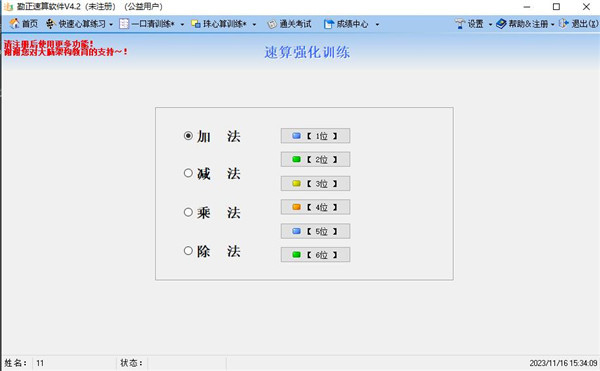 1、快速心算练习:快速心算练习提供快速强化训练,支持加减乘除四则运算,支持自定义位数,用户可根据自身基础选择难度练习