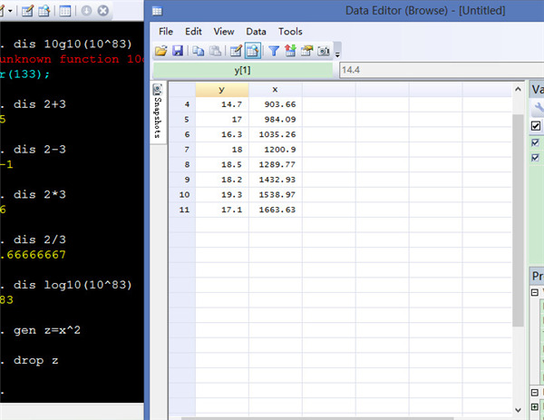 例如,我想生成一个新变量z,它等于x的平方,则输入gen z=x^2。打开数据浏览器,就可以看到数据中多了一列。