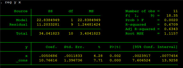 3、画出拟合线命令:twoway (scatter y x)(lfit y x)